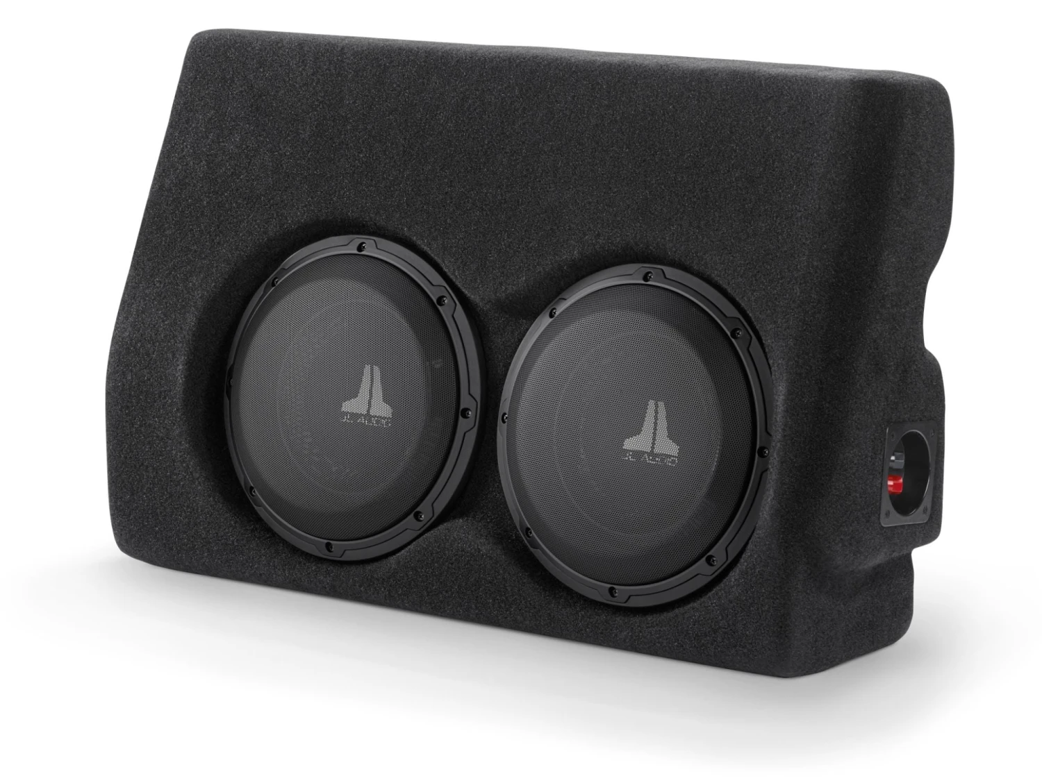 The Hard Data: Contains two 10W1v3-4 subwoofers in a sealed enclosure. 600 watt power handling. Wired for 2 ohm mono. Installs behind passenger-side rear seat. Black steel mesh woofer grilles are included. Requires permanent modifications to the plastic trim panels behind the rear seat and relocation of OEM amplifier, if vehicle is so equipped. Ability to use passenger side and center childseat anchors is lost with installation.